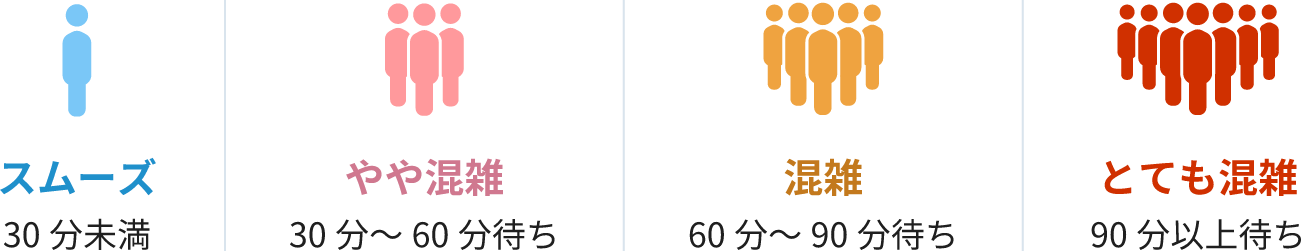 混雑度は4段階で表しています。「とても混雑」の日は2時間以上お待ちいただく可能性があります。