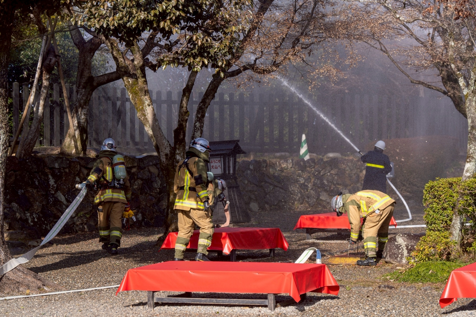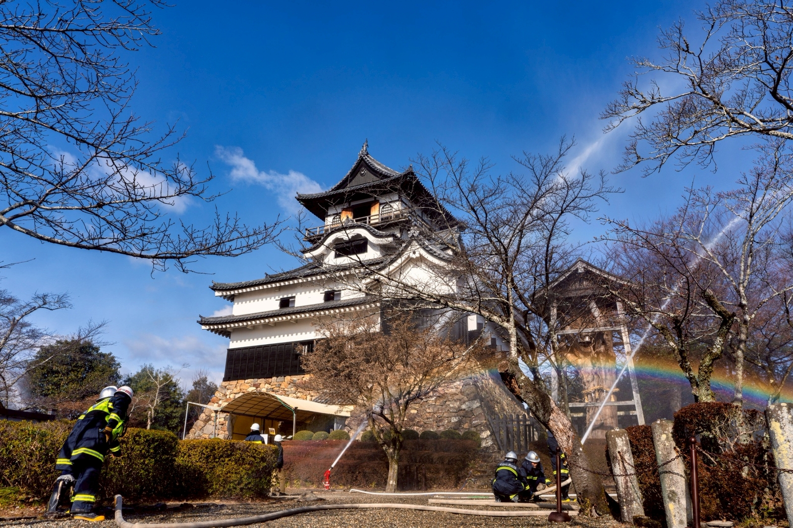 お知らせ 2026/1/26 運営からのお知らせ 消防訓練を実施しました 犬山城の消防訓練 1月26日の「文化財防火デー」に、犬山城で消防訓練が行われました。天守から火が出たという想定で、管理事務所職員や消防職員らが実際に放水するなどして消火手順を確認しました。 一覧へ戻る
